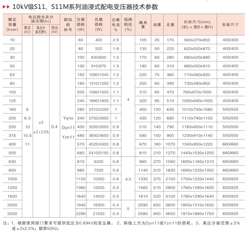 S11系列产品在S9系列的基础上,空载损耗平均降低了30%;空载电流比S9下降70-85%;平均温升降低10K,产品使用寿命增加一倍多,即使在超负载20%的条件下仍可长期运行;产品运行噪音平均降低2-4分贝。