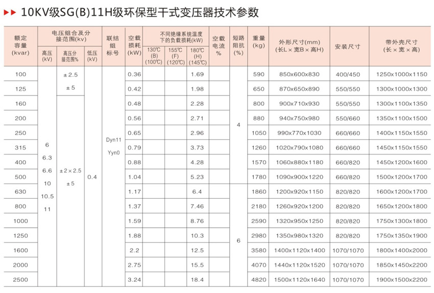 SG(B)11 型H 级绝缘干式电力变压器承受热冲击能力强,过负载能力大、难燃、防火性能高、低损耗、局部放电量小、噪声低、不产生有害气体、不污染环境、对湿度、灰尘不敏感、体积小、不开裂、维护简便因此,适宜用于防火要求高,负荷波动大以及污秽潮湿的恶劣环境中如:机场、发电厂、冶金作业、医院、高层建筑、购物中心、居民密集区以及石油化工、核电站、核潜艇等特殊环境中。