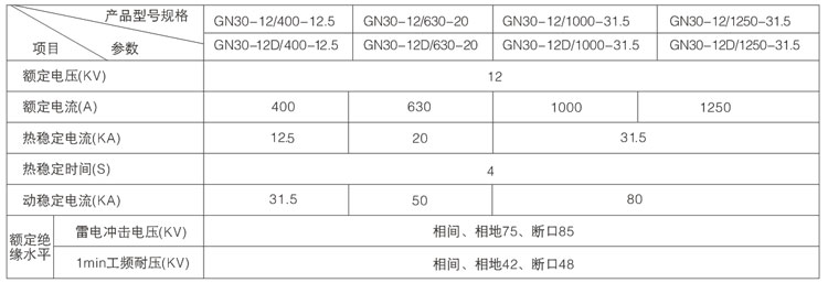 GN30-12D型开关是在GN30-12型开关基础上增加带接刀的形式,可满足不同电力系统的需要。本产品设计紧凑、占用空间小、绝缘能力强、易于安装调整,其性能符合GB1985-89《交流高压隔离开关和接地开关》的要求,适用于额定电压10千伏交流50Hz以下户内系统中,作为在有电压无负载情况下,分合电路之用。可与高压开关柜配套使用,也可单独使用。