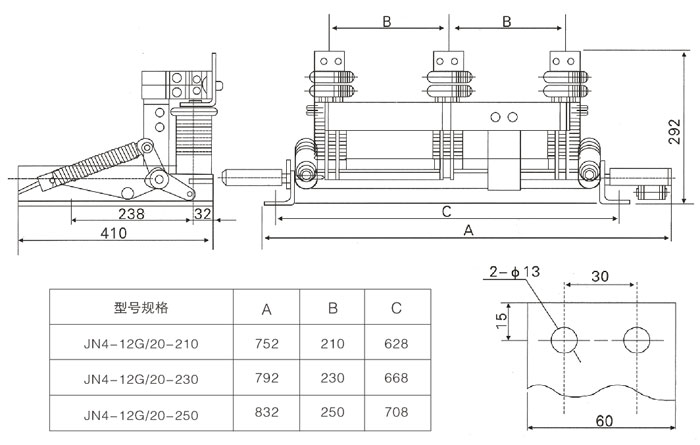 JN4-12(G)型户内高压接地开关,是配用于12KV户内交流金属凯装移开金属封闭开设备及其它高压开关设备的主要元件,也可以单独使用。作为在12KV及以下的交流50Hz电力系统中接地保护用,具有关合短路电流能力、结构合理、体积小、操作灵活、易安装调整。